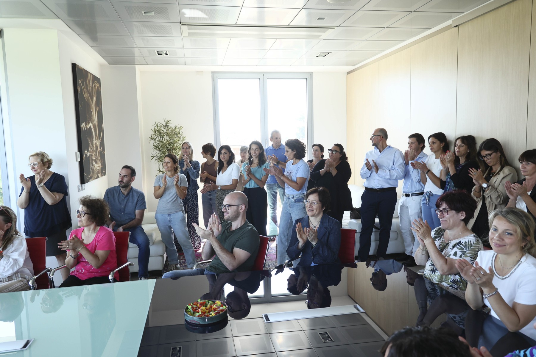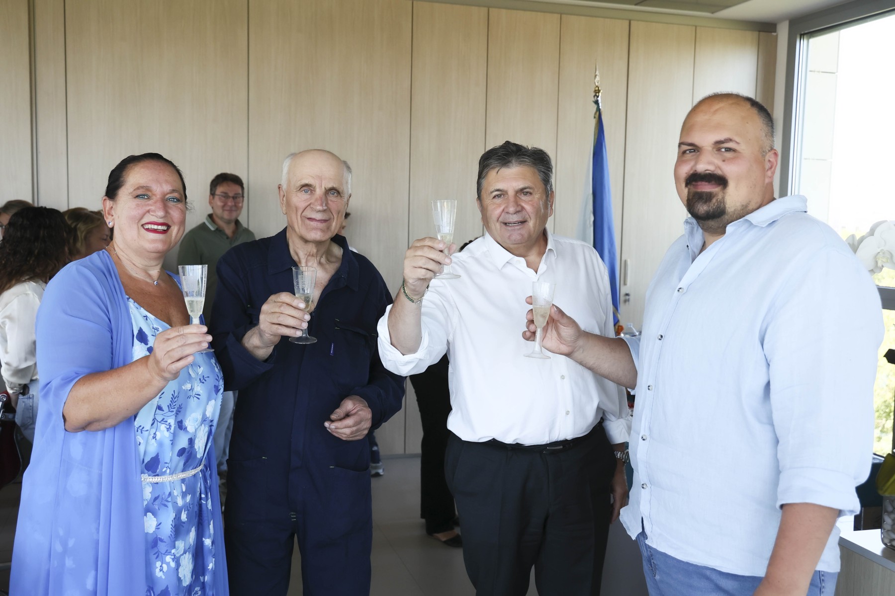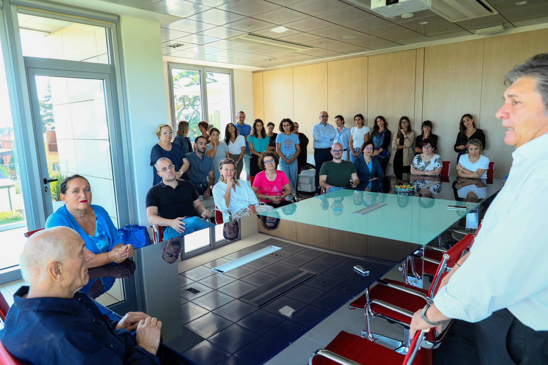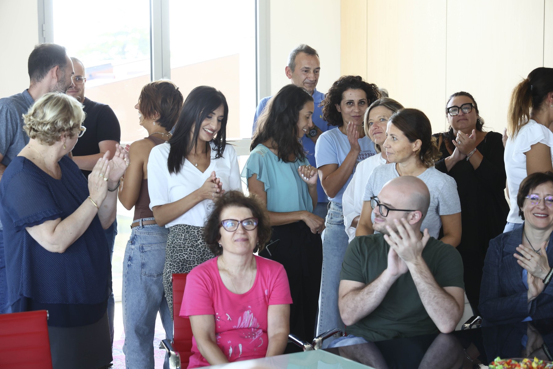 Pochi secondi di commozione, occhi lucidi e anche un po’ imbarazzato, poi via a stringere mani, ricevere complimenti, prima di assaggiare la torta preparata in suo onore.