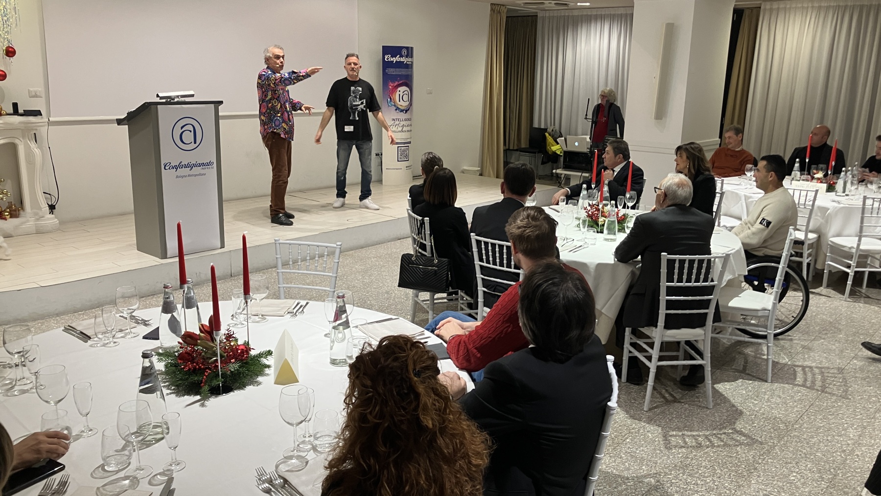 L’incontro si aperto con un momento di comicità offerto da Davide Dalfiume e Marco Dondarini, che hanno offerto una serie di sketch del loro repertorio. A seguire, dopo gli auguri del presidente metropolitano, Tiziano Poggipollini, del presidente regionale, Davide Servadei, e del vice presidente regionale, Graziano Gallerani, si è svolto un talk show durante il quale il segretario metropolitano e regionale, Amilcare Renzi, guidato dal giornalista e coach, Massimo Max Calvi, ha raccontato i valori che ispirano l’associazione coinvolgendo alcuni dei presenti nel presentare il loro lavoro e la loro esperienza in Confartigianato.